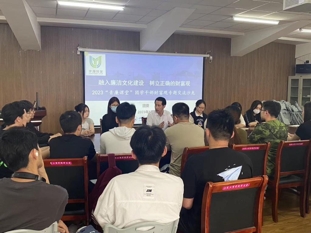 团委负责人以《融入廉洁文化建设,树立正确的财富观——团学干部的应知应懂应会》做第一期主讲。在领学了《山东工商学院财富管理特色建设实施办法》《山东工商学院“青廉课堂”行动方案》后,对上一阶段开展的财商教育校园文化活动和“青廉课堂”主题团日活动做了梳理。并从聚焦学校特色建设树立正确的财富观、团学干部的义与利、学生干部筑牢思想道德防线中的自律与他律三个方面,做了工作分享。与会师生围绕主题,结合各学院、各学生组织工作中的有关案例,交流了经验和心得体会。